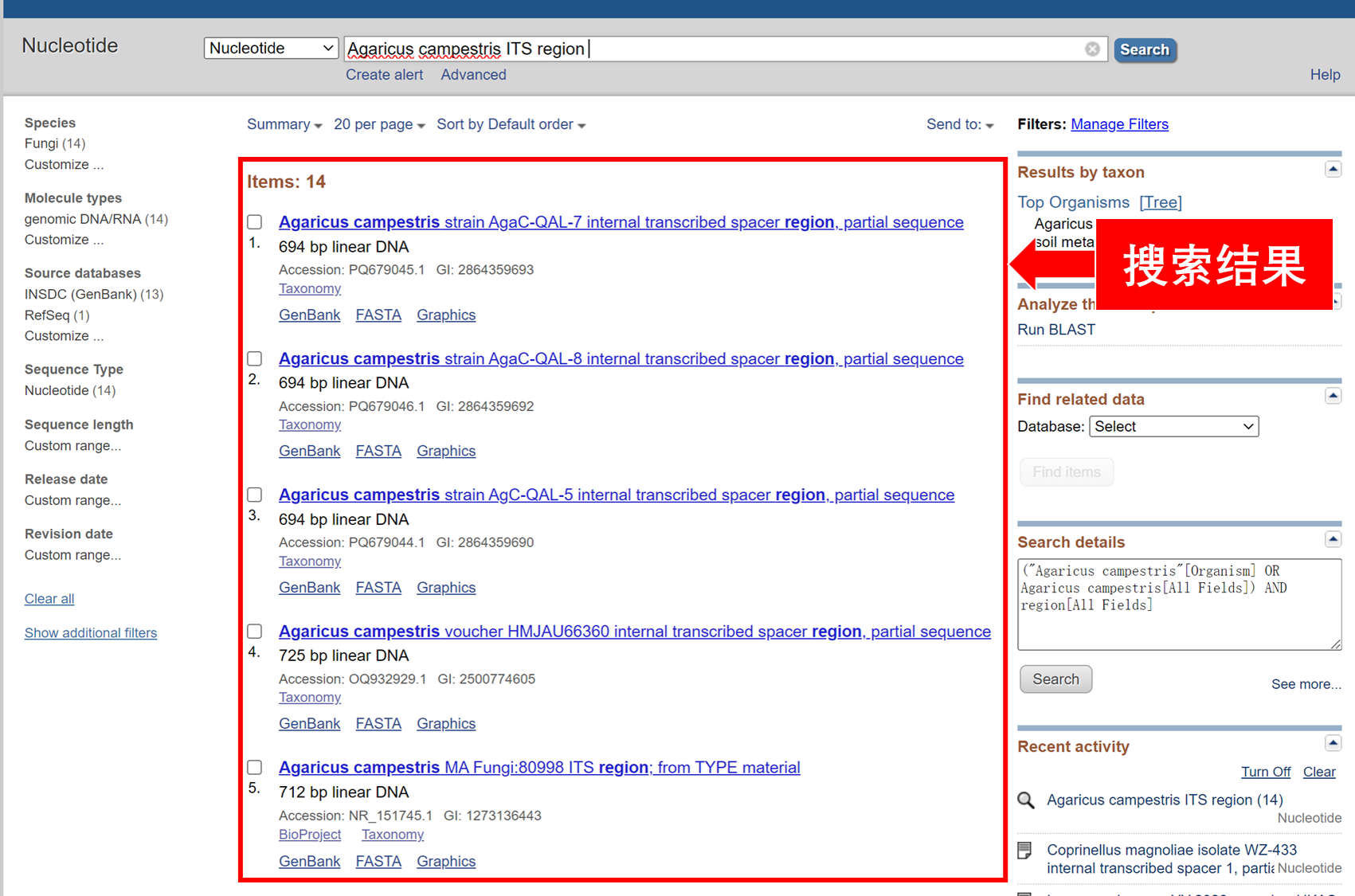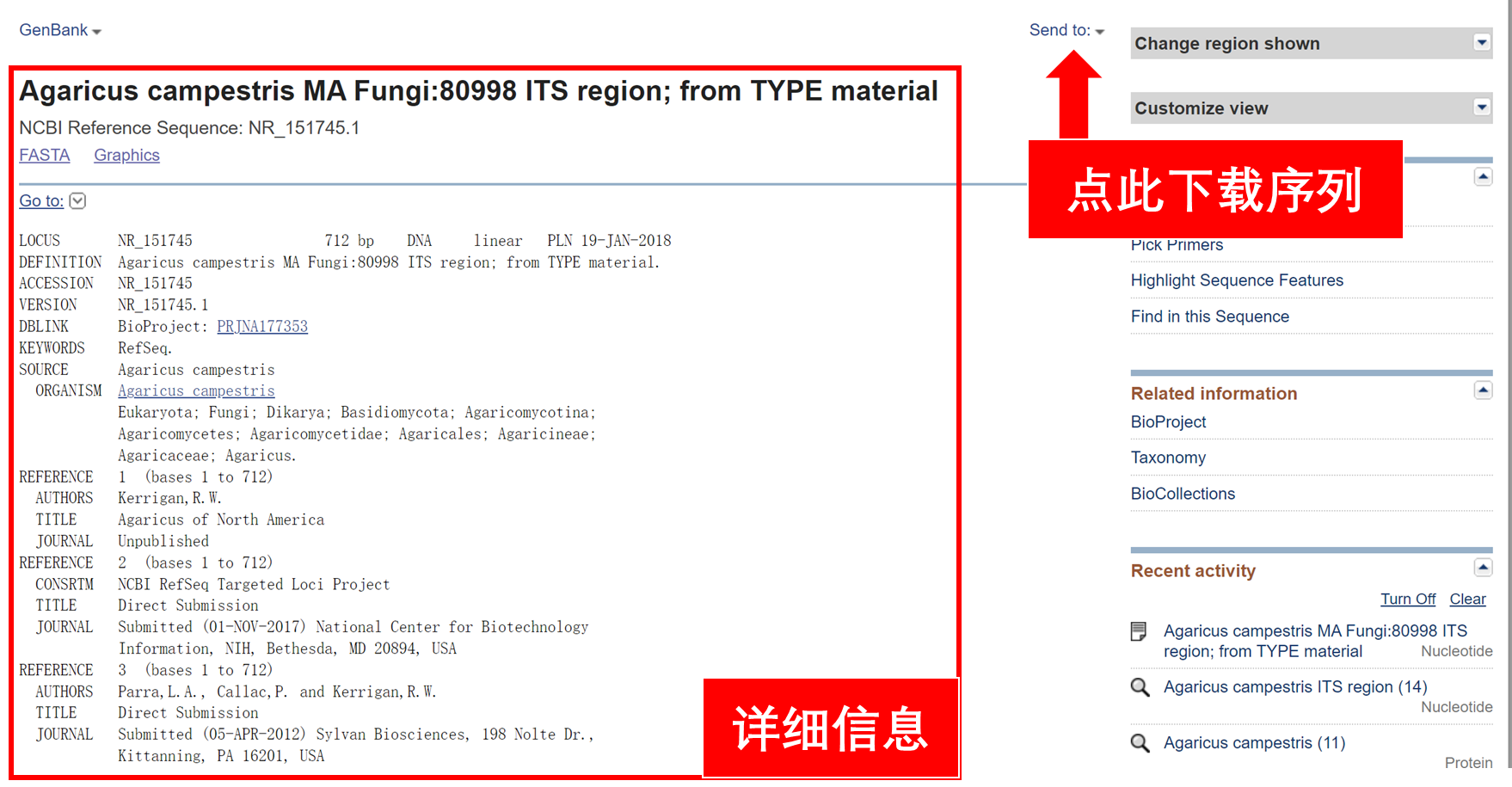 下载完成后,可以用记事本打开.gb或.fasta文件。GenBank格式的内容和网页上展示的内容是一样的。Fasta格式的文件如下:>NR_151745.1 Agaricus campestris MA Fungi:80998 ITS region; from TYPE material