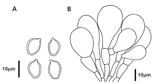 大青褶伞Chlorophyllum molybdites A.担孢子(平截芽孔) B.缘囊体,比例尺=10μm