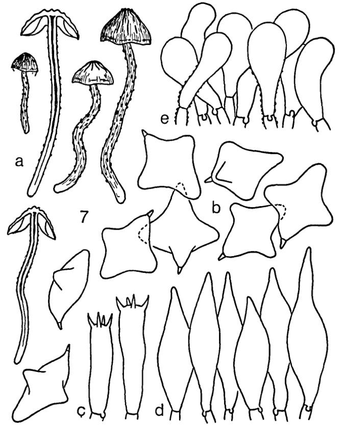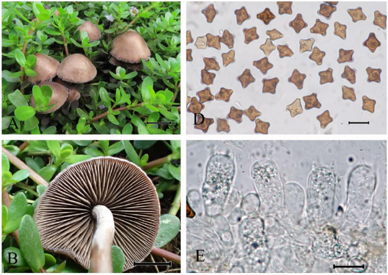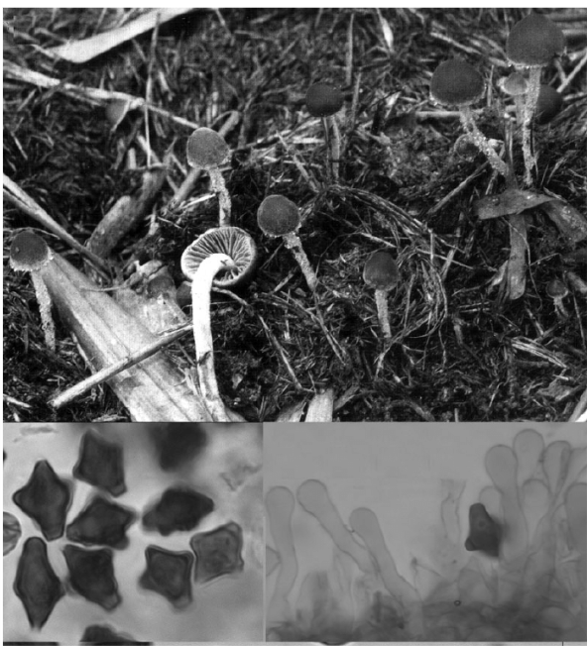该物种的主要特征是菌盖和菌柄褐色调;菌褶斑驳状,以褐色为主;担孢子十字形。此物种的定义存在争议,且相关系统学研究较少。该物种在我国台湾省有报道。命名历史该种最早在1973年被Hongo发表,当时置于疣孢斑褶菇属Panaeolin...... | ![]() |